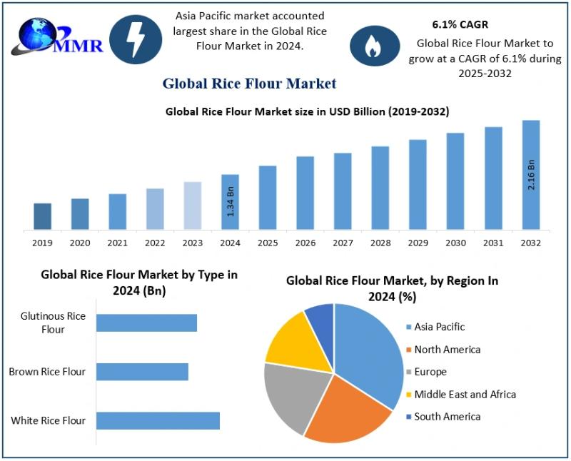 The Global Rice Flour Market was valued at approximately USD 1.34 Billion in 2024 and is expected to grow at a CAGR of 6.1%, reaching an estimated USD 2.16 Billion by 2032.