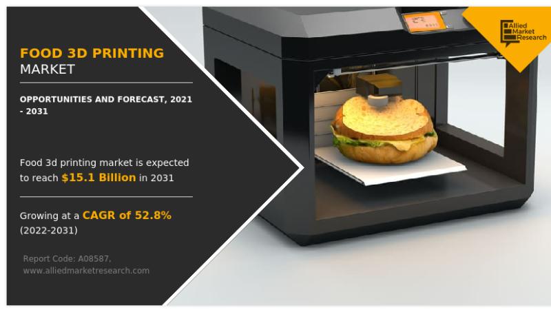 According to a new report published by Allied Market Research, titled, "Food 3D Printing Market," The Food 3D Printing Market Size was valued at $226.20 million in 2021, and is estimated to reach $15.1 billion by 2031, growing at a CAGR of 52.8% from 2022 to 2031.Get Research Sample with Detailed Insights : https://www.alliedmarketresearch.com/request-sample/8952