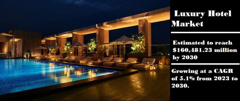 The Luxury Hotel Market size was valued at $95,113.00 million in 2022 and is estimated to reach $160,481.23 million by 2030, growing at a CAGR of 5.1% from 2022 to 2030.Luxury hotels are commercial establishments that offer luxurious and high-end lodging experiences to travelers, tourists, and guests. They usually include business, airport, and suite hotels and resorts. These accommodations offer lavish services, such as spas, swimming pools, dine-in restaurants, salons, private beaches, and fitness centers. They also provide fast, convenient, and discrete check-in and check-out, smart planning and booking process, laundry, business centers, babysitting, dog walking, and concierge services.