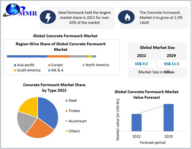 You can edit or delete your press release The Global Concrete Formwork Market, valued at USD 9.9 billion in 2022, is projected to grow at a CAGR of 2.3% and reach USD 11.5 billion by 2029. The market is driven by the rise in population, urbanization, and increased construction activities worldwid here