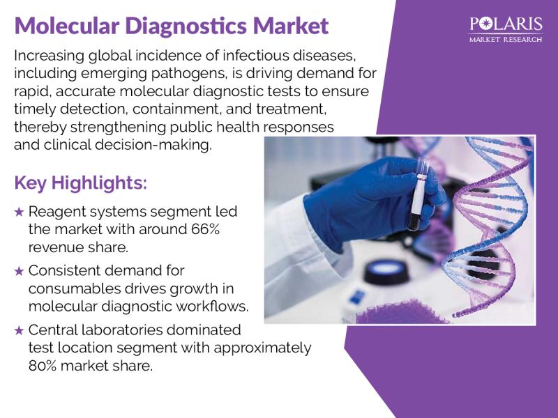Polaris Market Research recently introduced the latest update on Molecular Diagnostics Market that provides an extensive outlook of the market, analyzing key growth opportunities, challenges, risk factors, and emerging trends across diverse geographic regions. The report offers a definitive and meticulous analysis of the Molecular Diagnostics market size, share, demand, key growth factors, segmentation, country-level overview, and forecast.