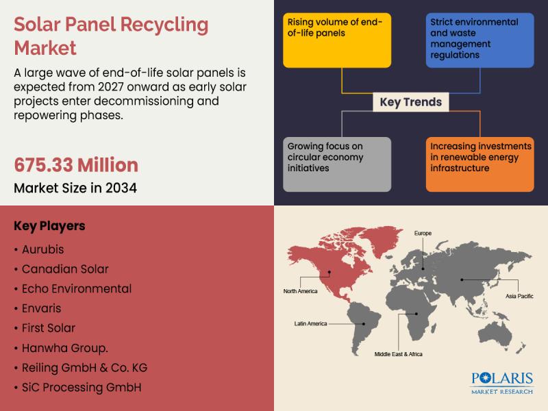 Global Solar Panel Recycling Market is currently valued at USD 353.88 million in 2025 and is anticipated to generate an estimated revenue of USD 675.33 million by 2034, according to the latest study by Polaris Market Research. Besides, the report notes that the market exhibits a robust 7.5% Compound Annual Growth Rate (CAGR) over the forecasted timeframe, 2026 - 2034
