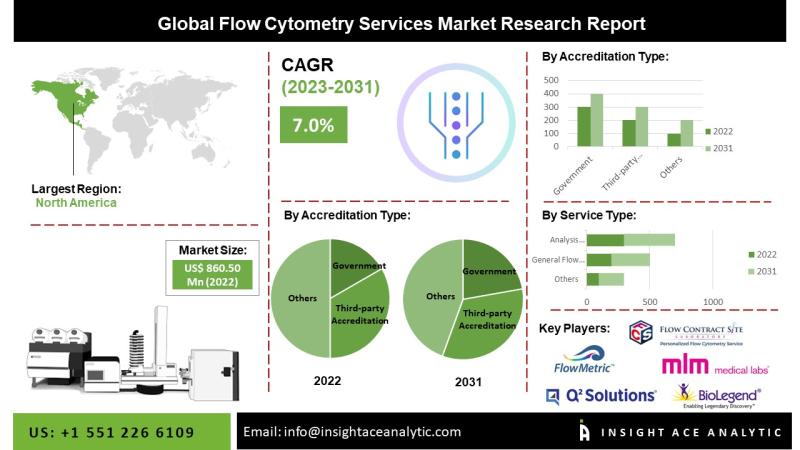 "Flow Cytometry Services Market by Accreditation Types (Government and Third-party accreditation), Services types Type of General Flow Cytometric Service (assay development and consumables manufacturing), Type of Based Analysis Based Flow Cytometric Services (PBMC Analysis, Whole Blood Cells Analysis, Bone Marrow Aspirate Analysis, Stem Cells Analysis, Rare Cells Detection, Cell Profiling And Subsetting, Intracellular Staining), Others - Market Trends, Industry Competition Analysis, Revenue and Forecast To 2031."According to the latest research by InsightAce Analytic, the global Flow Cytometry Services market is valued at US$ 860.50 Million in 2022, and it is expected to reach US$ 1568.58 Million by 2031, with a CAGR of 7.0 % during the forecast period of 2023-2031.