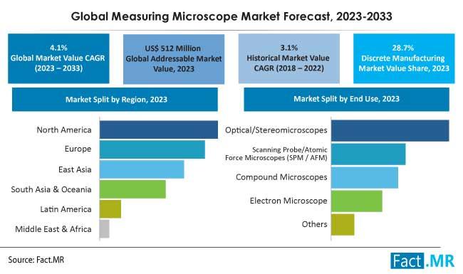 The estimated value of the global measuring microscope market is expected to be US$ 512 million in 2023 and to rise at a CAGR of 4.1% to US$ 765.2 million by 2033. By the end of 2022, sales of measuring microscopes held a nearly 38% market share worldwide.The global market for measuring microscopes had a CAGR of 3.1% from 2018 to 2022, according to Fact.MR, is a supplier of market research and competitive information.
