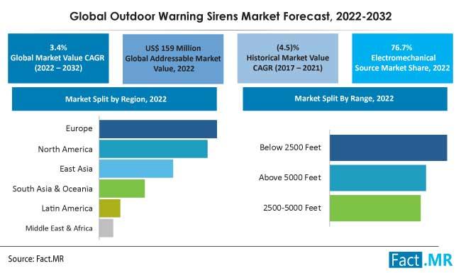 The global outdoor warning sirens market is set to surpass a valuation of US$ 159.4 million in 2022 and further grow at a CAGR of 3.4% to reach 222.8 million by the end of 2032.Electromechanical Warning Sirens accounted for more than 75% in global outdoor warning siren market,The market value is predicted to be US$ 159.4 Mn in 2022 with the market showing a Y-o-Y growth rate of 2.5% in 2022. With the pandemic situation now under control, the market is expected to witness moderate CAGR of 3.4% and is expected to be valued at US$ 222.8 Mn by 2032.