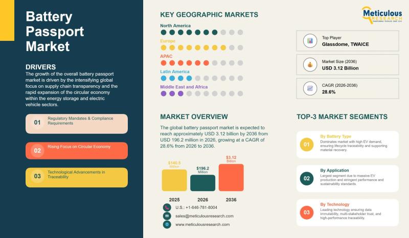 The global battery passport market was valued at USD 140.5 million in 2025 and is expected to reach around USD 3.12 billion by 2036, growing from USD 196.2 million in 2026 at an annual rate of 28.6% over the forecast period. This rapid expansion is being driven by a convergence of forces: governments tightening their requirements around supply chain transparency, battery manufacturers and EV producers needing to demonstrate regulatory compliance,…