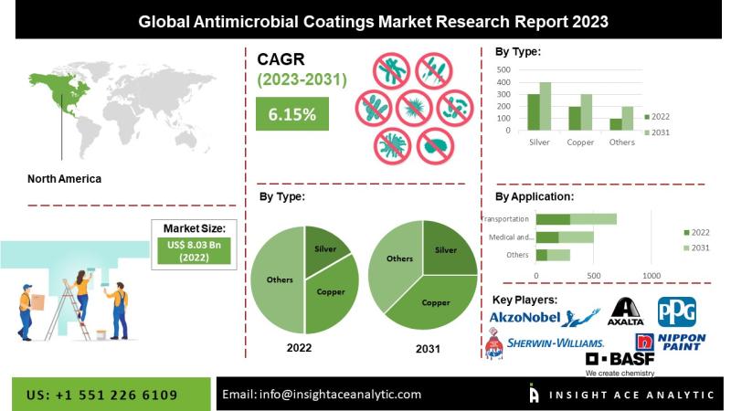 InsightAce Analytic Pvt. Ltd. announces the release of a market assessment report on the "Global Antimicrobial Coatings Market Size, Share & Trends Analysis Report By Type (Silver, Copper And Titanium Dioxide) And End-Use Industry (Medical & Healthcare, Building & Construction, Protective Clothing, HVAC System, And Transportation Automotive)- Market Outlook And Industry Analysis 2031"The global antimicrobial coatings market is estimated to reach over USD 13.47 billion by 2031, exhibiting a CAGR of 6.15% during the forecast period.