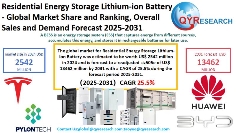 The global market for Residential Energy Storage Lithium-ion Battery was estimated to be worth US$ 2542 million in 2024 and is forecast to a readjusted size of US$ 13462 million by 2031 with a CAGR of 25.5% during the forecast period 2025-2031.