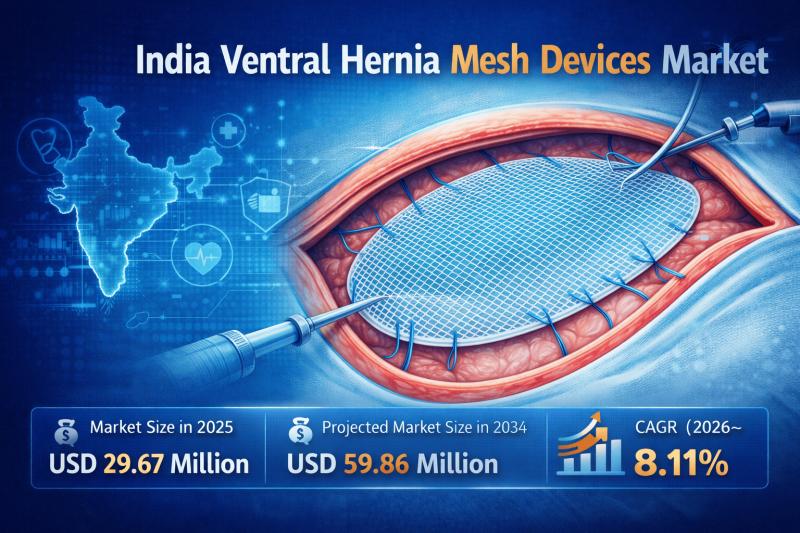 IMARC Group's latest research publication, "India Ventral Hernia Mesh Devices Market Size, Share, Trends and Forecast by Mesh Type, Indication, Procedure, End Use, and Region, 2026-2034" the India ventral hernia mesh devices market size reached USD 29.67 Million in 2025. The market is expected to reach USD 59.86 Million by 2034, exhibiting a growth rate (CAGR) of 8.11% during 2026-2034.