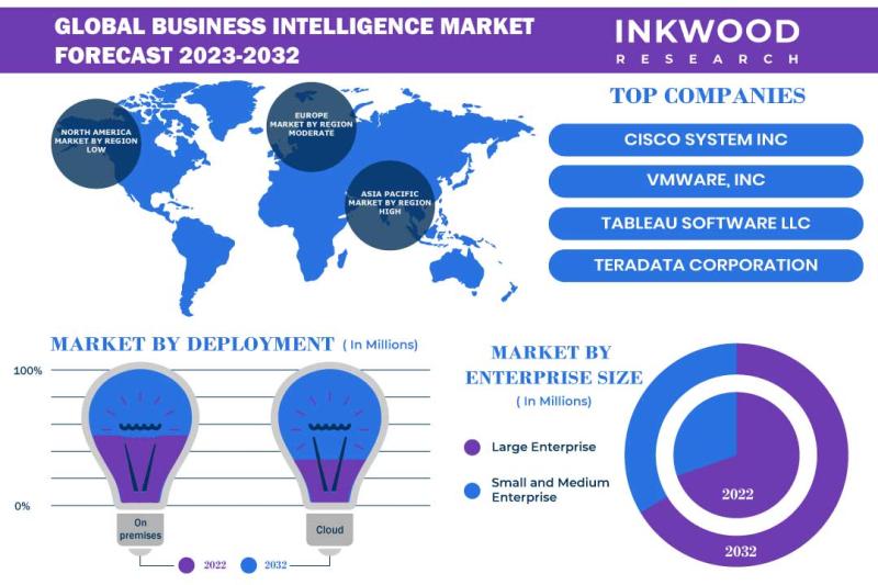 Inkwood Research anticipates that the Global Business Intelligence Market is set to surge with a 9.68% CAGR and generate $53761.82 million during the forecast period 2023-2032.Browse 71 market data Tables and 89 Figures spread over 200+ Pages, along with an in-depth analysis of the Global Business Intelligence Market by Enterprise Size, Deployment, Function, Vertical, & by Geography.