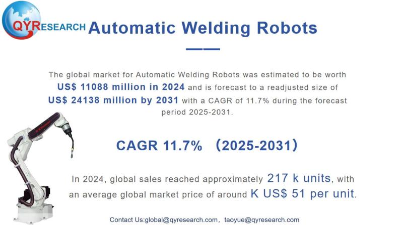 The global market for Automatic Welding Robots was estimated to be worth US$ 11088 million in 2024 and is forecast to a readjusted size of US$ 24138 million by 2031 with a CAGR of 11.7% during the forecast period 2025-2031.