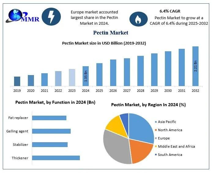 Pectin Market size was valued at USD 1.35 Billion in 2024 and the total Pectin revenue is expected to grow at a CAGR of 6.4% from 2025 to 2032, reaching nearly USD 2.21 Billion.