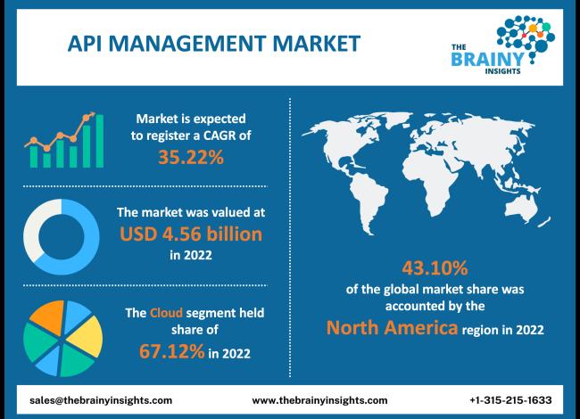 As per the report published by The Brainy Insights, the global API management market is expected to grow from USD 4.56 Billion in 2022 to USD 93.19 Billion by 2032, at a CAGR of 35.22% during the forecast period 2023-2032. The North American region emerged as the most significant global API Management market, with a revenue share of 43.10% in 2022. The region has a high market growth rate due to the increasing number of data-operating companies. The investment in API management software and services will drive the North American market. The growing utility of solutions such as big data, IoT, cloud-based software, digital transformation, etc., is propelling the growth of API management. The Asia-Pacific region is anticipated to grow lucratively during the forecast period. The market is witnessing a lucrative growth rate due to the rising adoption of API technology, such as in India and China. Further, the rise in investment in cloud solutions has positively impacted the API management market.API Management Market Size by Deployment (Cloud and On-Premises), Component [Services (Consulting, Training and Education, Support and Maintenance) and Software (API Security, API Platform and API Analytics)], Organization Size (Small and Medium Scale Organization and Large Scale Organization), End-user (Retail, BFSI, Telecom and IT, Healthcare and Life science, Government and Education and Others), Regions, Global Industry Analysis, Share, Growth, Trends, and Forecast 2023 to 2032