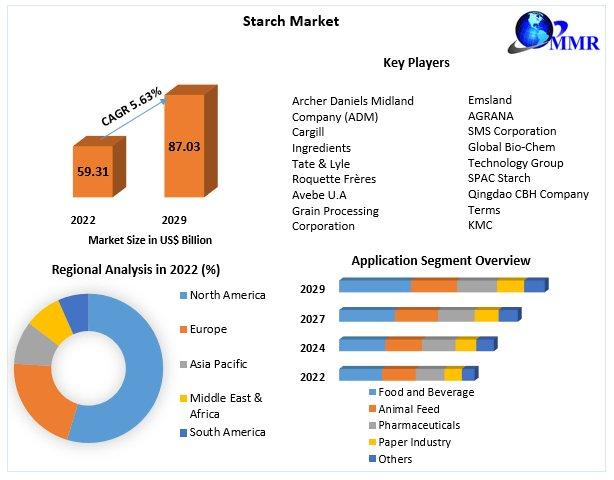 Starch Markethe global Starch Market, valued at US$ 59.31 billion in 2022, is set to experience significant growth, with an expected revenue increase of 5.63% from 2023 to 2029. The market is projected to reach nearly US$ 87.03 billion.