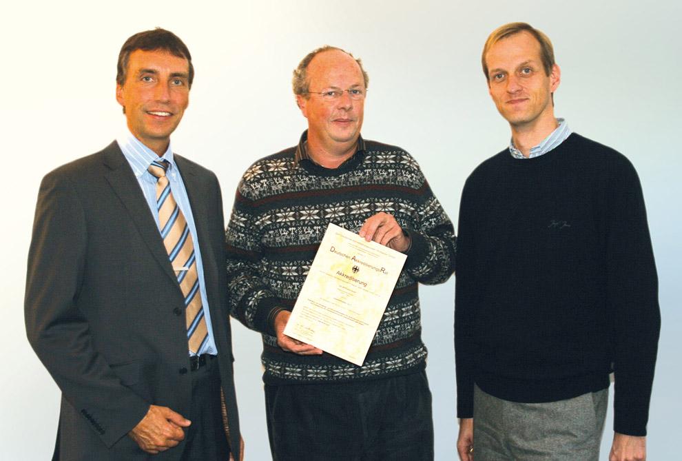 Dr. Stefan Kettelhoit, Dr. Eckhard Milsmann and Ralf Sibbing received the certificate that turns Haelsa Pharma GmbH Inspection Body into the first accredited service provider for API audits in the European Union.