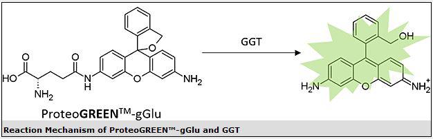 ProteoGREEN™-gGlu is rapidly activated by g-glutamyltranspeptidase (GGT), which is known to be a tumor-associated enzyme, to give a highly fluorescent compound. The membrane-permeable ProteoGREEN™-gGlu is applicable to live cells or in vivo imaging of cancer cells.