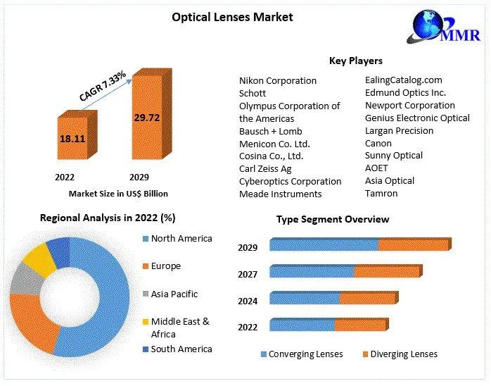 Optical Lenses Market Report Scope:The global Optical Lenses Market is on a remarkable growth trajectory, as revealed by the latest market report. In 2022, the market was valued at a significant US$ 18.11 billion, and it is projected to surge to an impressive US$ 29.72 billion by 2029. This forecasted growth, with a Compound Annual Growth Rate (CAGR) of 7.33% during the forecast period, underscores the expanding influence of optical lenses across various sectors.