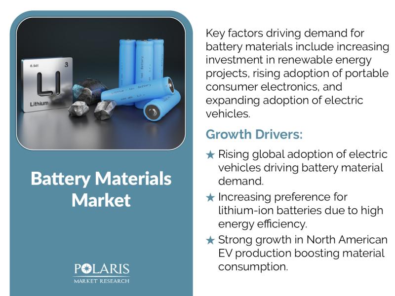 Global Battery Materials Market is currently valued at USD 74.21 Billion in 2024 and is anticipated to generate an estimated revenue of USD 265.59 Billion by 2034, according to the latest study by Polaris Market Research. Besides, the report notes that the market exhibits a robust 13.62 % Compound Annual Growth Rate (CAGR) over the forecasted timeframe, 2025 - 2034