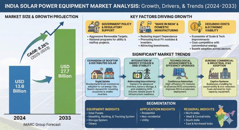 NOIDA, INDIA - IMARC Group, a leading market research company, has released a new report titled "India Solar Power Equipment Market Size, Share, Trends and Forecast by Equipment, Application, and Region, 2025-2033." The study offers a comprehensive analysis of the industry, covering market share, growth, trends, and regional insights.