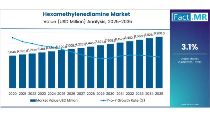 The global hexamethylenediamine (HMDA) market is set for steady growth, driven by rising demand for high-performance nylon production, advanced coatings, and specialty chemical applications. According to recent analysis by Fact.MR, the market is projected to expand from USD 6,800.0 million in 2025 to approximately USD 9,200.0 million by 2035, registering a CAGR of 3.1% during the forecast period.