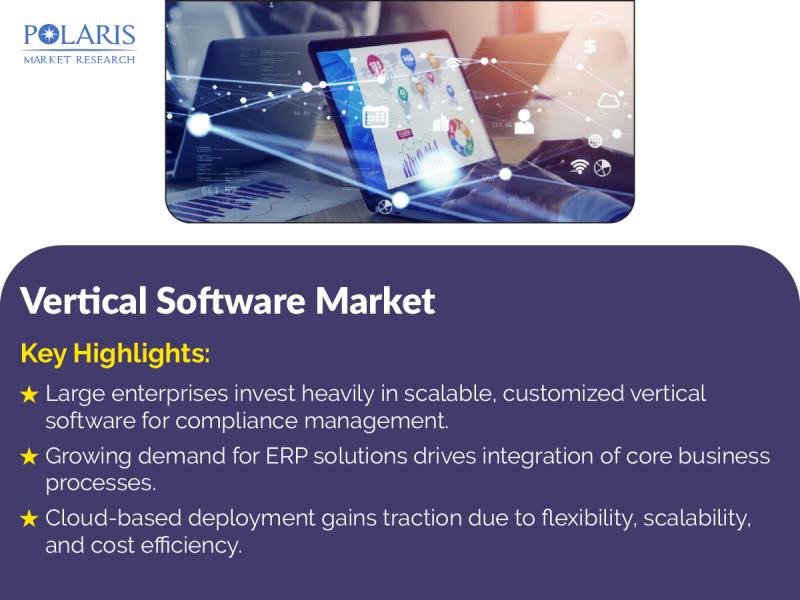 Polaris Market Research recently introduced the latest update on Vertical Software Market that provides an extensive outlook of the market, analyzing key growth opportunities, challenges, risk factors, and emerging trends across diverse geographic regions. The report offers a definitive and meticulous analysis of the Vertical Software Market size, share, demand, key growth factors, segmentation, country-level overview, and forecast.