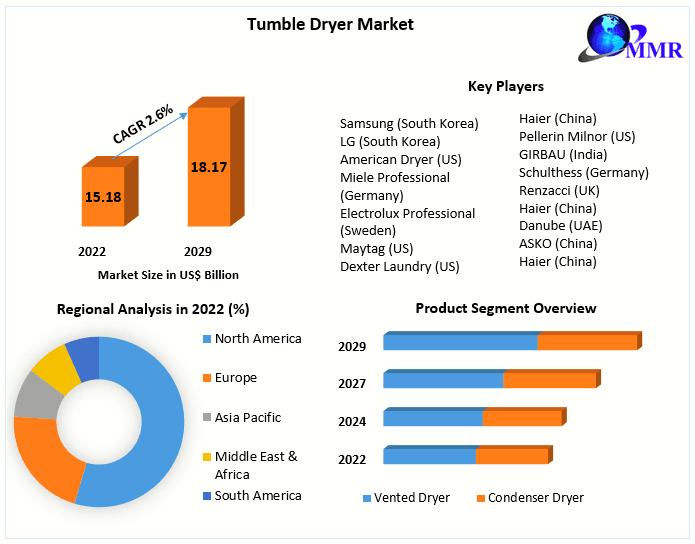 Tumble Dryer Market Overview:Maximize Market Research is a market research firm that has delivered a detailed analysis of the "Tumble Dryer Market". The report includes key business insights, demand analysis, pricing analysis, and competitive landscape. Tumble Dryer Market was valued at US$ 15.18 Bn. in 2022. Global Tumble Dryer Market size is estimated to grow at a CAGR of 2.6% over the forecast period.