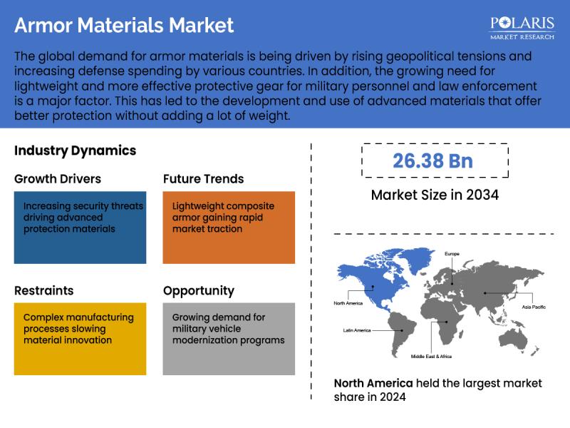 Global Armor Materials Market is currently valued at USD 13.44 billion in 2024 and is anticipated to generate an estimated revenue of USD 26.38 billion by 2034, according to the latest study by Polaris Market Research. Besides, the report notes that the market exhibits a robust 7% Compound Annual Growth Rate (CAGR) over the forecasted timeframe, 2025 - 2034
