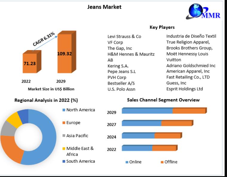 You can edit or delete your press release The global jeans market was valued at US$ 71.23 billion in 2022, with a projected CAGR of 6.31% from 2023 to 2029, reaching approximately US$ 109.32 billion. here