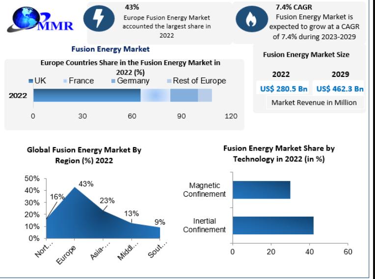 You can edit or delete your press release The Global Fusion Energy Market demonstrated significant growth, with a valuation of USD 280.5 Bn. in 2022. Forecasts indicate continued expansion, with Fusion Energy revenue expected to increase by 7.4% from 2023 to 2029, reaching a remarkable USD 462.3 here