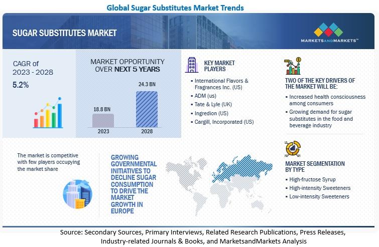 A research report titled "Sugar Substitutes Market by Type (High-Fructose Syrup, High-Intensity Sweeteners, Low-Intensity Sweeteners), Composition, Application (Beverages, Food Products, & Health & Personal Care Products), Source, Form, Region - Global Forecast to 2028," published by MarketsandMarkets, projects that the global sugar substitutes market will witness significant growth, reaching USD 24.3 billion by 2028, up from USD 18.8 billion in 2023. This growth is expected to occur at a compound annual growth rate (CAGR) of 5.2% during the forecast period.Download PDF Brochure: https://www.marketsandmarkets.com/pdfdownloadNew.asp?id=1134