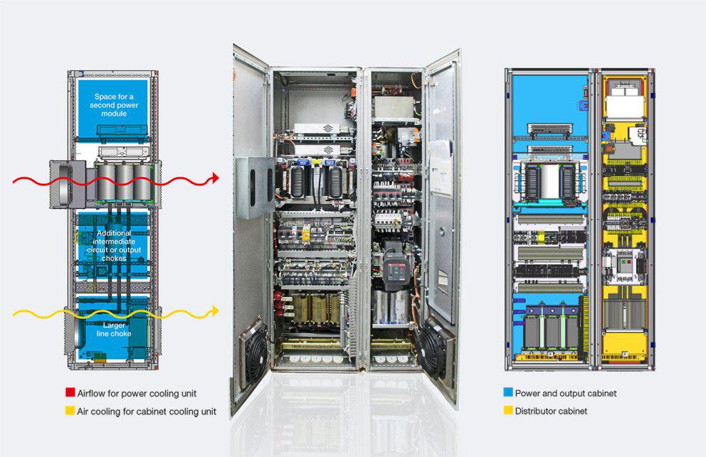 The new power converters deliver compact dimensions by eliminating the conventional control cabinet and and overhead fans. The result is an optimized two-cabinet system consisting of a distributor cabinet, power cabinet, integrated control technology, door mounted cooling fans and simplified connection panels.