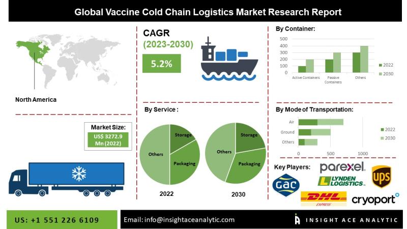 InsightAce Analytic Pvt. Ltd. announces the release of a market assessment report on the "Global Vaccine Cold Chain Logistics Market By Services (Storage, Packaging, And Transportation), By Packaging Methods (Dry Ice, Liquid Nitrogen, Gel Packs), Mode Of Transportation (Ground, Air, Ocean), Holding Temperature Range (Vaccines Requiring Refrigerated Temperature, Vaccines Requiring Frozen Temperature, Vaccines Requiring Cryogenic Temperature), Containers (Active Containers, Passive Containers))- Trends, Industry Competition Analysis, Revenue and Forecast To 2030."According to the latest research by InsightAce Analytic, the global vaccine cold chain logistics market is valued at US$ 2.84 billion, and it is expected to reach US$ 4.90 billion by 2030, with a CAGR of 5.2% during the forecast period of 2022-2030.