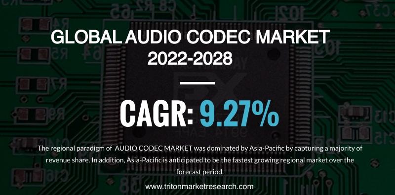 As per Triton Market Research's report, the global audio codec market attained $2324.10 million in 2021, and is deemed to progress at a CAGR of 9.27% by 2028.A recent study by Triton Market Research titled Global Audio Codec Market includes the Global Analysis and Forecasts by Component (Software Audio Codec, Hardware Audio Codec), Application (Computer, True Wireless Stereo (TWS), Wearables, Portables, Smart Home, Home Entertainment, Over-Ear Headphones, Commercial, Tablets, Automotive, Phones, Other Applications), and by Geography (Latin America, Europe, Asia-Pacific, North America, Middle East and Africa).