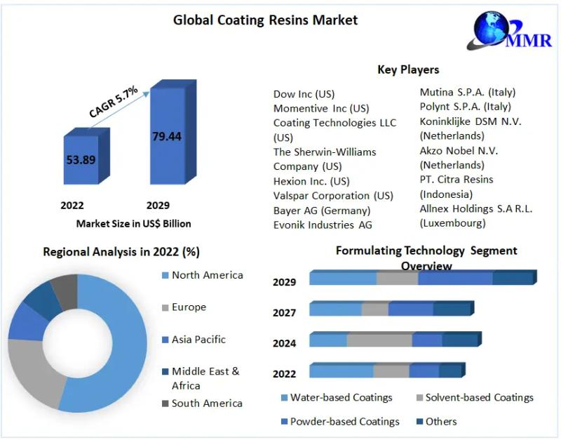 You can edit or delete your press release Coating Resins Market was valued at USD 53.89 Billion in 2022 and is expected to reach USD 79.44 Billion by 2029, exhibiting a CAGR of 5.7% during the forecast period (2023-2029). here