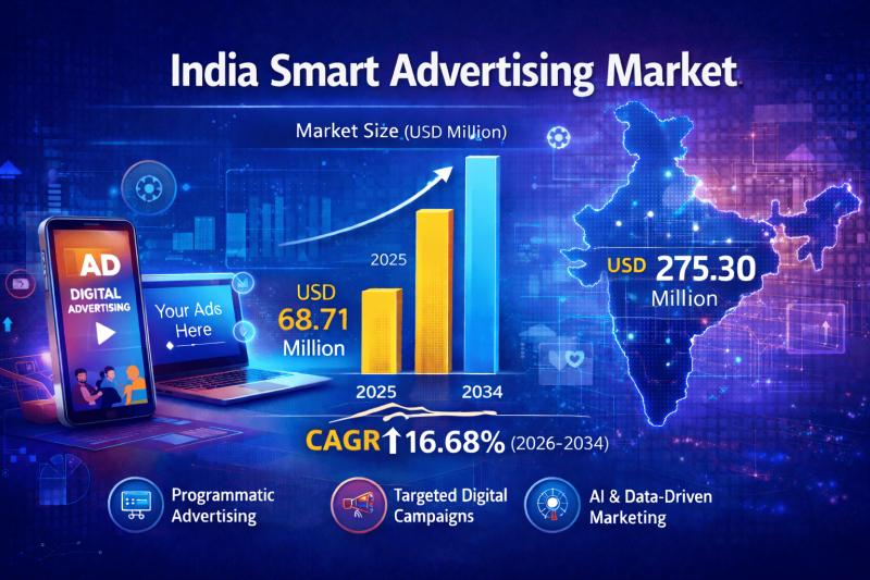 IMARC Group's latest research publication "India Smart Advertising Market Size, Share, Trends and Forecast by Component, Product, End Use, and Region, 2026-2034" the India smart advertising market size was valued at USD 68.71 Million in 2025. The market is expected to reach USD 275.30 Million by 2034, exhibiting a growth rate (CAGR) of 16.68% during 2026-2034.