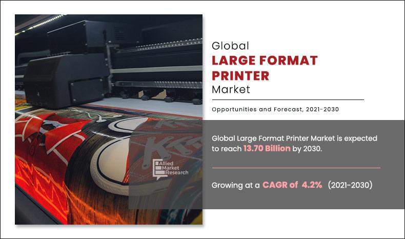 Allied Market Research published a report on the Large Format Printer Market by Offering (Printer, Software, and Service), Printing Technology (Inkjet Printing and Toner Based Printing (Laser Systems)), Print Width (11" TO 24", 24" TO 36", 34" TO 44", 44" TO 60", 60" TO 72", and Above 72"), Ink Type (Aqueous, Solvent, UV-Curable, Dye Sublimation, Latex, and Others), and Application (Apparels & Textiles, Signage, Advertising, Décor, CAD & Technical Printing, Construction, and Others): Global Opportunity Analysis and Industry Forecast, 2021-2030.The global large format printer market size was valued at $9.15 billion in 2020, and is projected to reach $13.70 billion by 2030, registering a CAGR of 4.2% from 2021 to 2030.