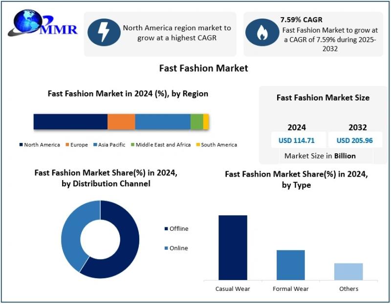 The Fast Fashion Market was valued at USD 114.71 billion in 2024 and is projected to expand at a CAGR of 7.59% from 2025 to 2032, reaching nearly USD 205.96 billion. This growth is fueled by rising demand for trendy, affordable apparel, the surge in online retail, and the influence of social media-driven fashion trends worldwide.
