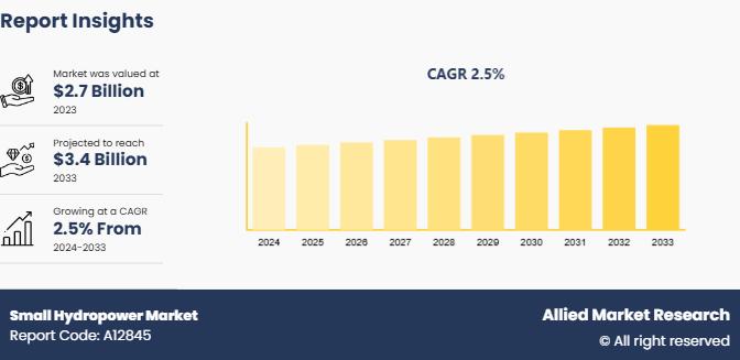 The global small hydropower market is witnessing steady growth as countries seek reliable, low-carbon energy sources to complement large-scale renewables. In 2023, the small hydropower market was valued at USD 2.7 billion and is projected to reach USD 3.4 billion by 2033, growing at a CAGR of 2.5% from 2024 to 2033.