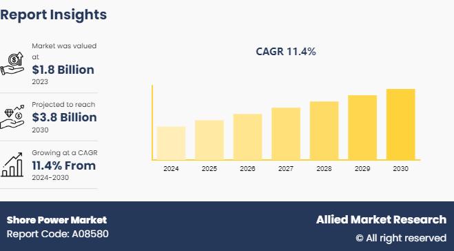 According to a new report published by Allied Market Research, the global shore power market was valued at $1.8 billion in 2023 and is projected to reach $3.8 billion by 2030, expanding at a CAGR of 11.4% from 2024 to 2030. Shore power, also known as cold ironing or alternative maritime power (AMP), enables vessels to plug into onshore electricity at ports, significantly reducing emissions and fuel consumption while docked.