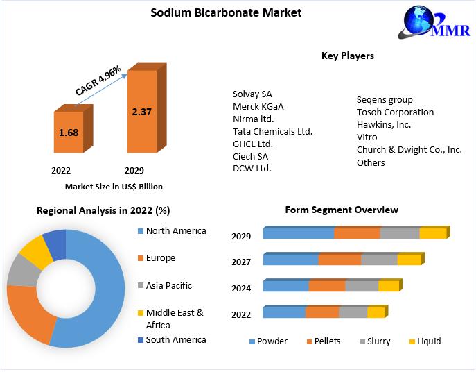 Sodium Bicarbonate market is expected to reach US$ 2.37 Bn. in 2029, with a CAGR of 4.96% for the period 2023-2029, because of the increased usage of sodium bicarbonate in various end-use industries such as food, animal feed, pharmaceuticals, and etc.