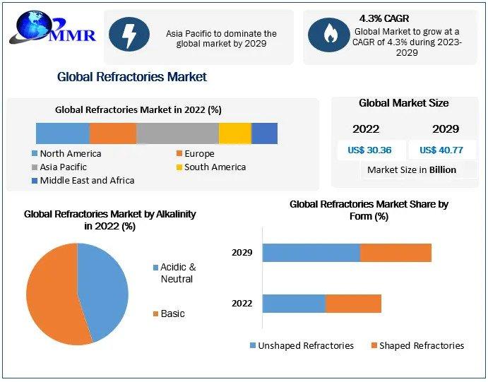 The Global Refractories Market, with a valuation of US$ 30.36 billion in 2022, is poised for substantial growth. The market is projected to reach nearly US$ 40.77 billion by 2029, boasting a CAGR of 4.3%.Report Scope and Methodology: