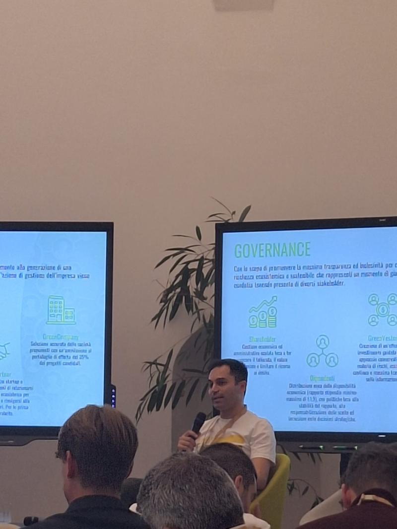 Domenico Amicuzi Real Estate Manager and Ethical Committee Member of Ener2Crowd, presents the impact report 2022 at the GreenVesting Forum 2023