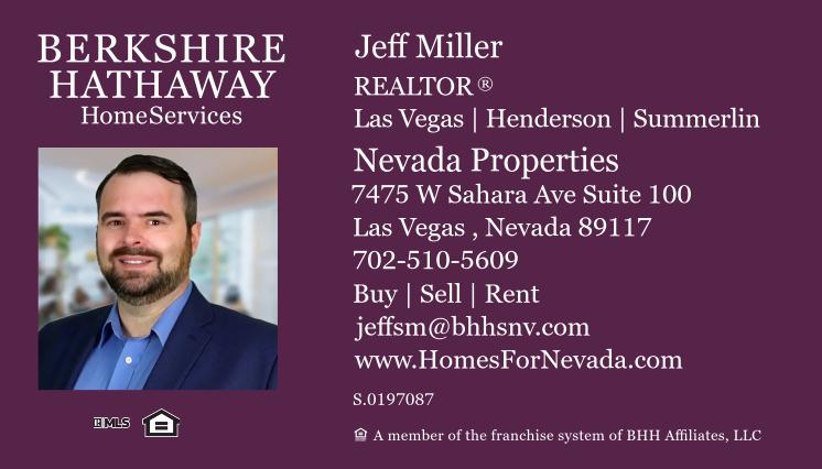 Jeff Miller REALTOR ® S.0197087 BHHS Nevada Properties is a full service Real Estate Professional serving Las Vegas, Henderson, Summerlin and all of Southern Nevada. His vision is to help every family in the area to buy a home or help them get top dollar for their current one.