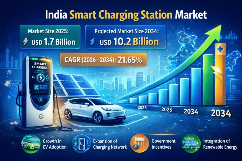 IMARC Group's latest research publication "India Smart Charging Station Market Size, Share, Trends and Forecast by Charging Technology, Connectivity, Battery Technology, Application, and Region, 2026-2034" the India smart charging station market size reached USD 1.7 Billion in 2025. The market is expected to reach USD 10.2 Billion by 2034, exhibiting a growth rate (CAGR) of 21.65% during 2026-2034.