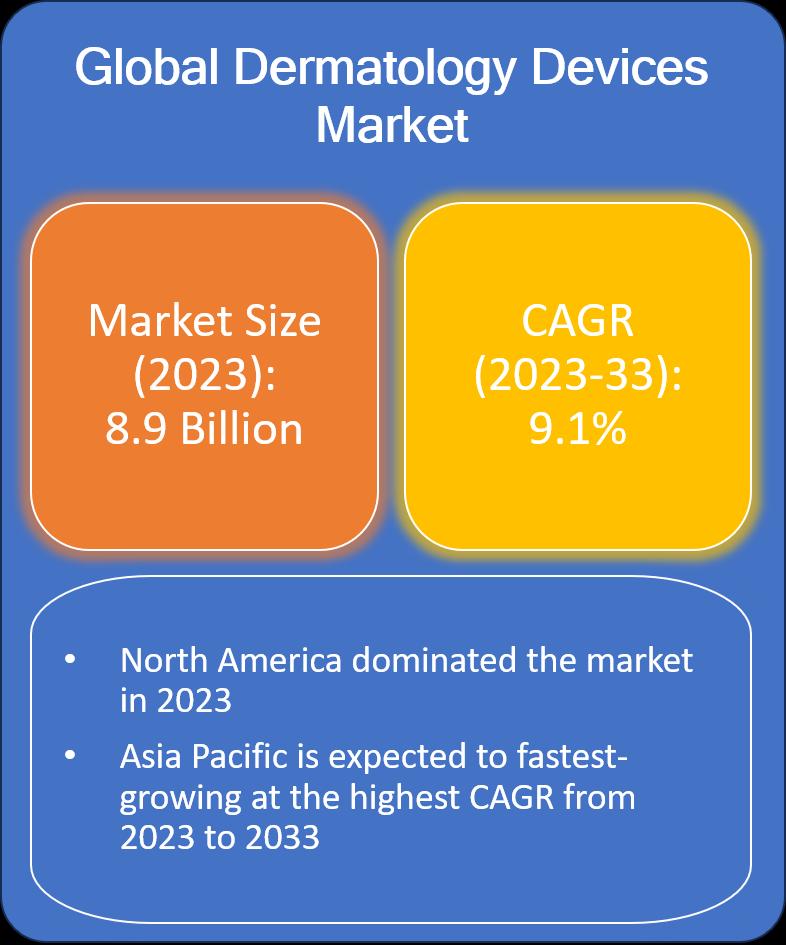 Key Highlights:• The global Dermatology Devices Market size was valued at USD 8.9 billion in 2023 growing at a CAGR of 9.1% from 2023 to 2033.