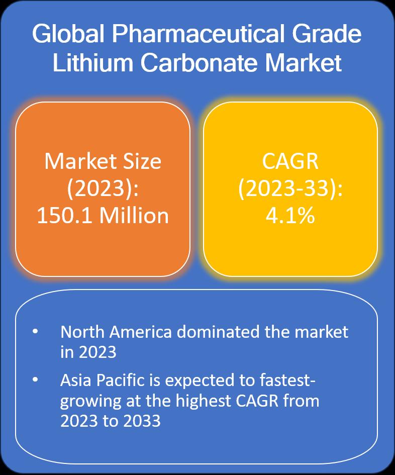 As per the study initiated by Evolve Business Intelligence, the global Pharmaceutical Grade Lithium Carbonate Market size accounted for USD 150.1 Million in 2023, growing at a CAGR of 4.1% from 2023 to 2033. Pharmaceutical-grade lithium carbonate is a form of lithium carbonate that meets specific purity and quality standards suitable for pharmaceutical applications. Lithium carbonate itself is a compound containing lithium, carbon, and oxygen, and it is commonly used in the treatment of certain psychiatric disorders, particularly bipolar disorder. The pharmaceutical grade ensures that the lithium carbonate used in medications is free from impurities and meets strict regulatory requirements.