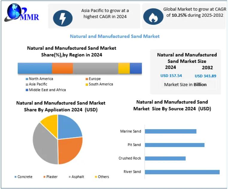 The Global Natural and Manufactured Sand Market was valued at USD 157.54 Billion in 2024 and is projected to reach USD 343.89 Billion by 2032, expanding at a CAGR of 10.25% during the forecast period (2025-2032).