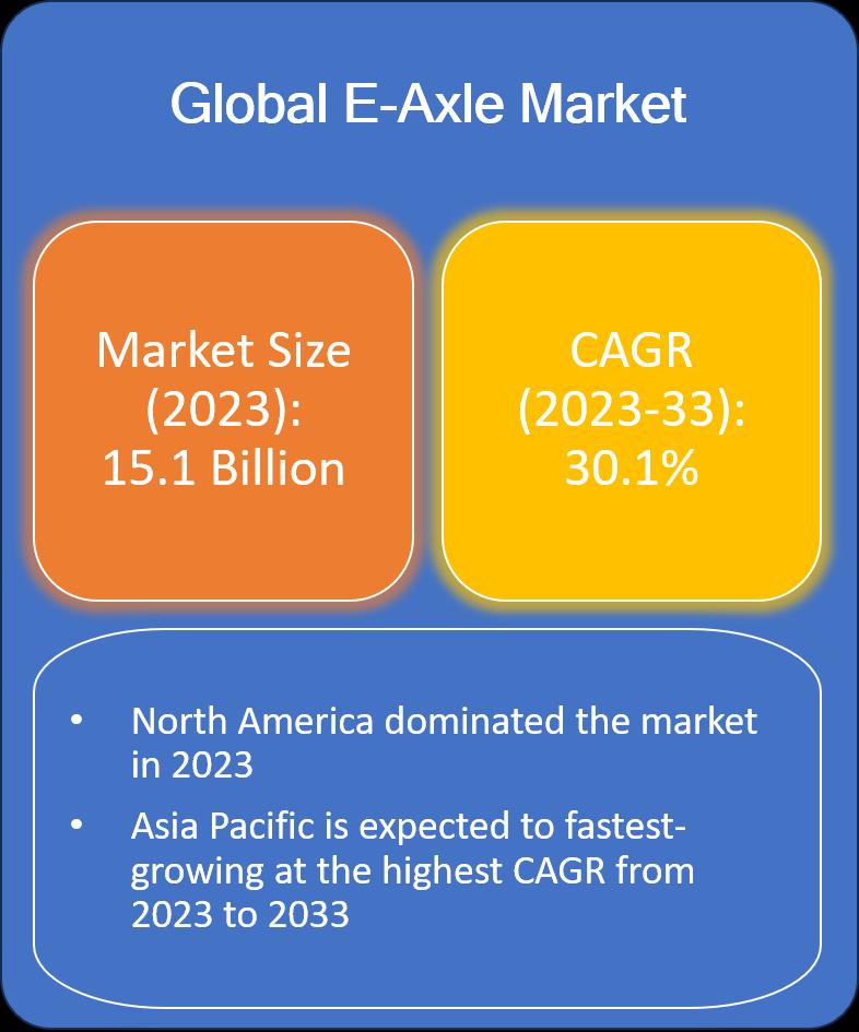 As per the study initiated by Evolve Business Intelligence, the global E-Axle Market size accounted for USD 15.1 Billion in 2023, growing at a CAGR of 30.1% from 2023 to 2033. An electric axle, often referred to as an E-Axle, is a propulsion system for electric vehicles (EVs) that integrates the electric motor, power electronics, and transmission into a single unit. This compact and integrated design simplifies the vehicle's drivetrain and contributes to overall efficiency and performance. The E-Axle concept is particularly popular in electric and hybrid vehicles, where space and weight considerations are critical.Request/Download PDF Sample: https://report.evolvebi.com/index.php/sample/request?referer=OpenPR&reportCode=021466