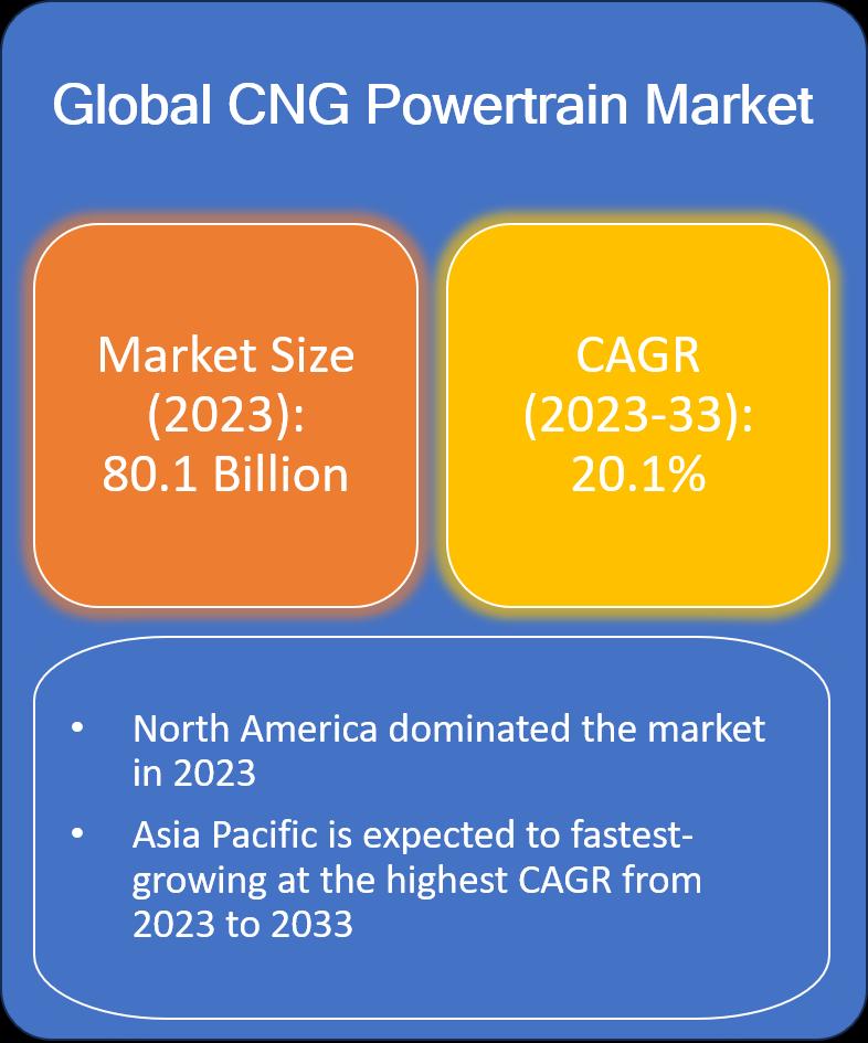 As per the study initiated by Evolve Business Intelligence, the global CNG Powertrain Market size accounted for USD 80.1 Billion in 2023, growing at a CAGR of 20.1% from 2023 to 2033. A CNG powertrain refers to a vehicle propulsion system that utilizes Compressed Natural Gas (CNG) as a fuel source. Compressed natural gas is composed mainly of methane and is stored in high-pressure cylinders on the vehicle. CNG powertrains are commonly used in various types of vehicles, including cars, trucks, buses, and even some industrial vehicles.Request/Download PDF Sample: https://report.evolvebi.com/index.php/sample/request?referer=OpenPR&reportCode=021557