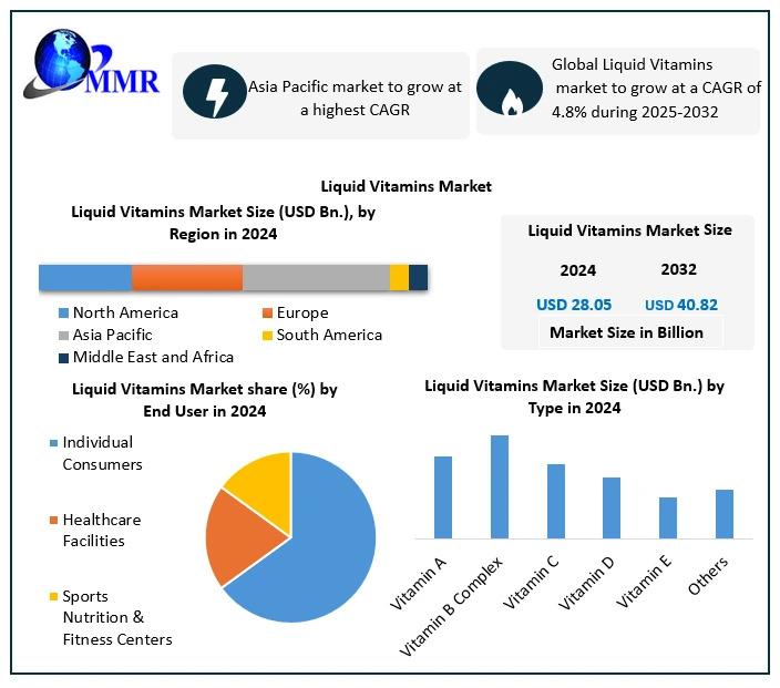 According to a new report by Maximize Market Research, the global Liquid Vitamins Market was valued at USD 28.05 billion in 2024 and is projected to reach USD 40.82 billion by 2032, growing at a CAGR of 4.8%. The increasing adoption of liquid vitamin supplements across pharmaceuticals, food & beverages, and cosmetics is fueling market expansion worldwide.